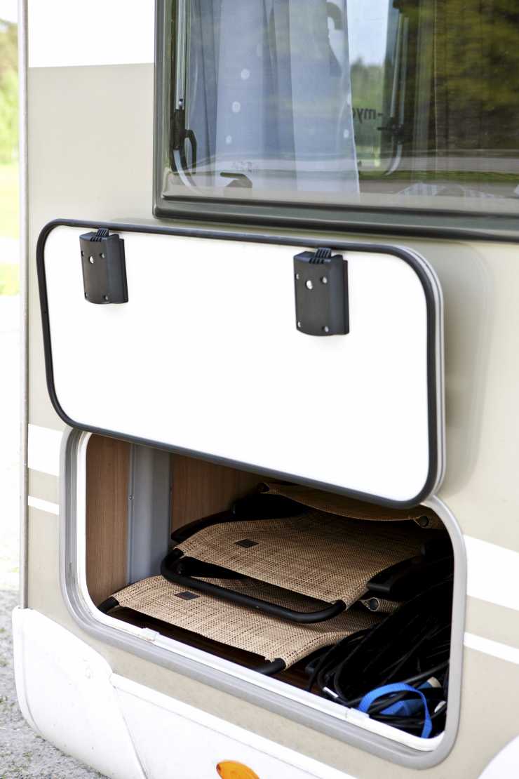 Under dubbelsängen finns förvaring som nås utifrån via en lucka som mäter 90 x 38 cm. Här finns också ett litet skåp som nås inifrån där lite underkläder och strumpor ryms.
