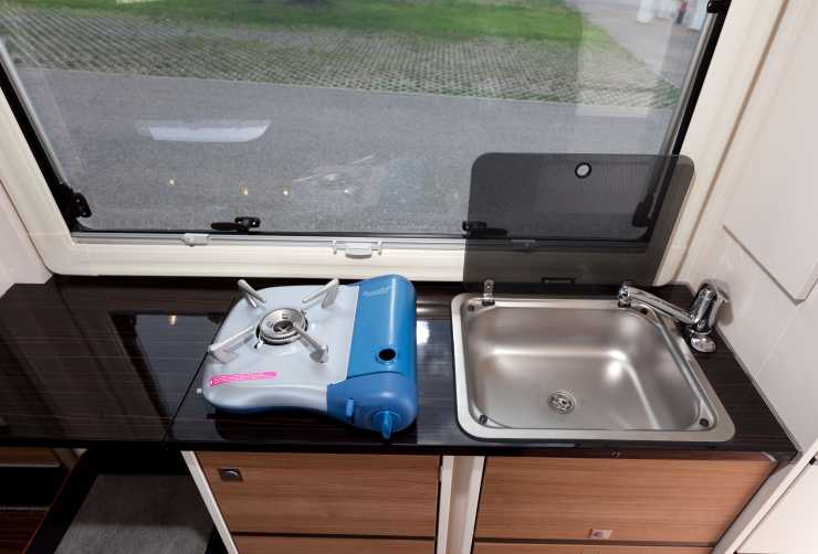En titt runt i bilen ger honom rätt. Direkt in till vänster finns, ja det beror sig på. Antingen en pall följt av en bänk, eller ett kök. Längst bort på bänken skvallrar en diskho om att utrymmet kan förvandlas. Jag fäller upp de skivor som finns, en ovanför pallen samt luckan under diskhon, det blir då ett förvånansvärt rymligt kök. Spisen är ett fristående enlågigt gasolkök som kan användas både ute och inne. När det inte används stuvas det lätt undan.