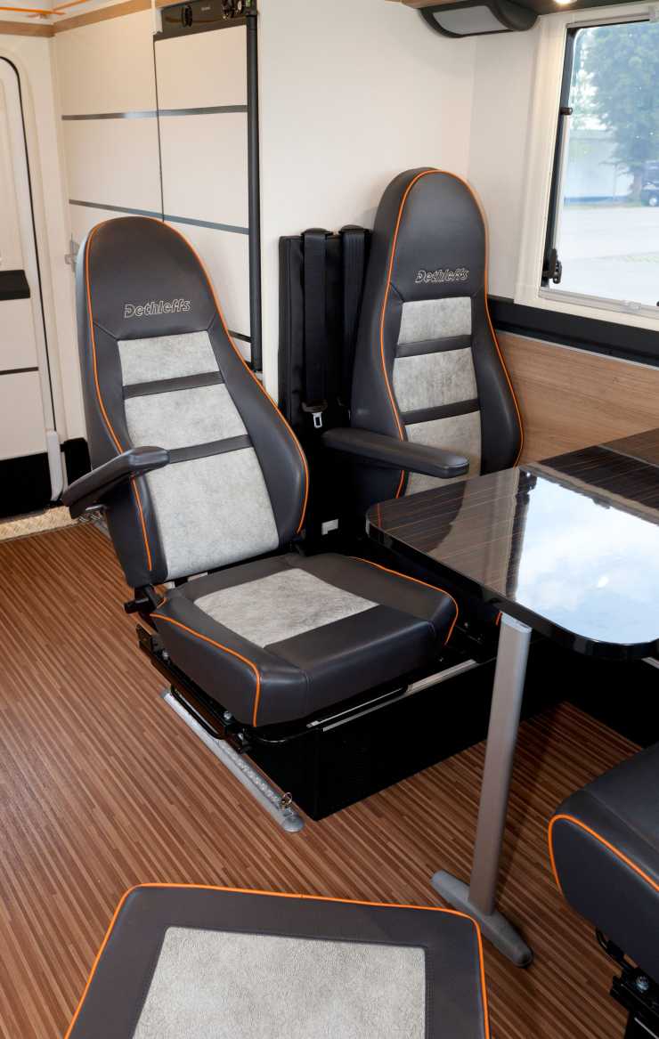 Sittgruppen är enligt mig bilens höjdpunkt. Den består av fyra platser fördelade i två motstående rader av skinnklädda stolar. Stolsryggarna går att luta bakåt och yttre sätena går även att skjuta i sidled. Dessa funktioner kan ibland hittas i några av de exklusivaste linermodellerna hos olika tillverkare. Att man sitter rak i ryggen i sittgruppen är den största käpphästen i princip alla husbilar jag testat. Pallen vid ingången kommer väl till pass här som fotstöd, den kan nämligen knäppas loss och flyttas runt. Tillbakalutad, med fötterna på pallen, sitter jag riktigt, riktigt skönt. Stolarna är från Aguti, en inte obekant tillverkare i husbilssammanhang. Men de här stolarna är ursprungligen tänkta för bussar.