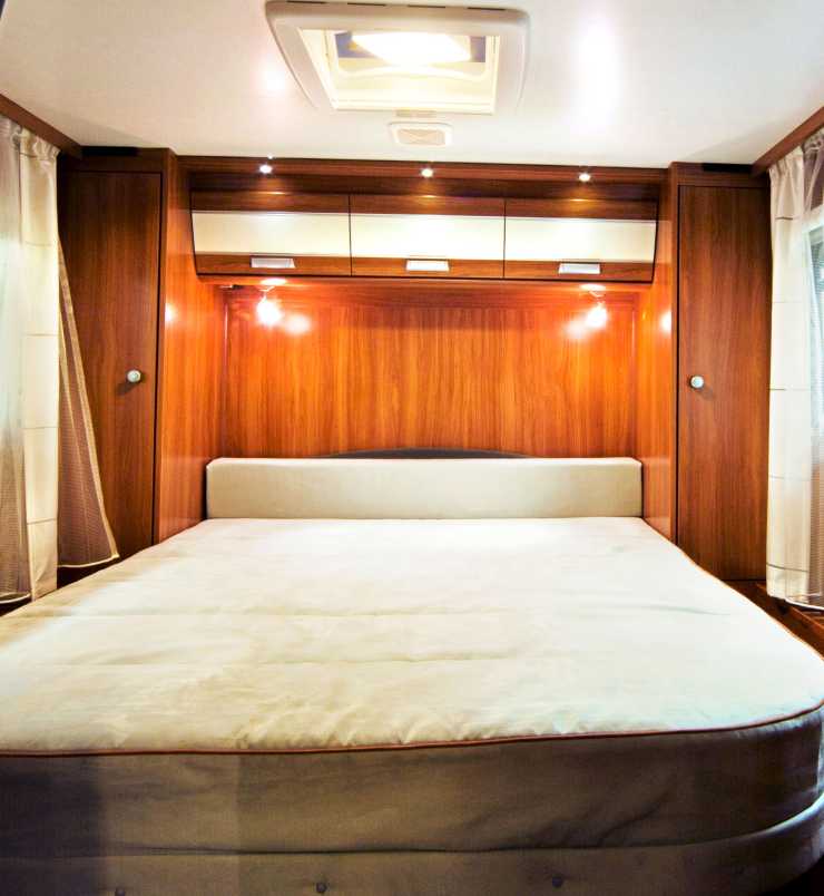 Kallskummadrassen, som är ganska fast, vilar på en ventilerad ribbotten. Samma gäller för övrigt den nerfällbara bädden framme i bilen. Den dras med handkraft ner över förarplatsen. Sovytan där blir 140x190 centimeter. Även den här kallskummadrassen ligger på ribbotten. Läslampan är placerad i huvudändan. Utrymmet bordas med en kort stege.