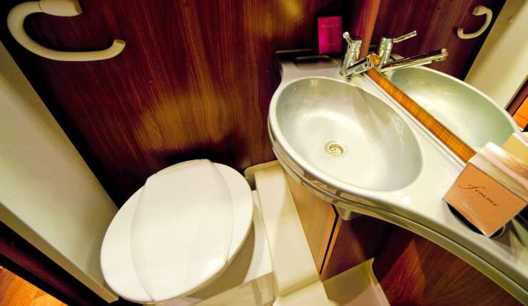 Köket och den främre delen av husbilen kan avskiljas från sovrummet med en gardin. Toaletten har elektrisk spolning och tack vare den vridbara sitsen kan man skapa sig knäutrymme även om stället används med stängd dörr. Morgontoaletten vid handfatet sker nog bekvämast med öppen dörr. Toaletten saknar uttag för 230 V eftersom det är en del av ett våtutrymme. Hängare för handdukar finns inbyggda i dörren. Ventilationen ordnas genom en liten taklucka.