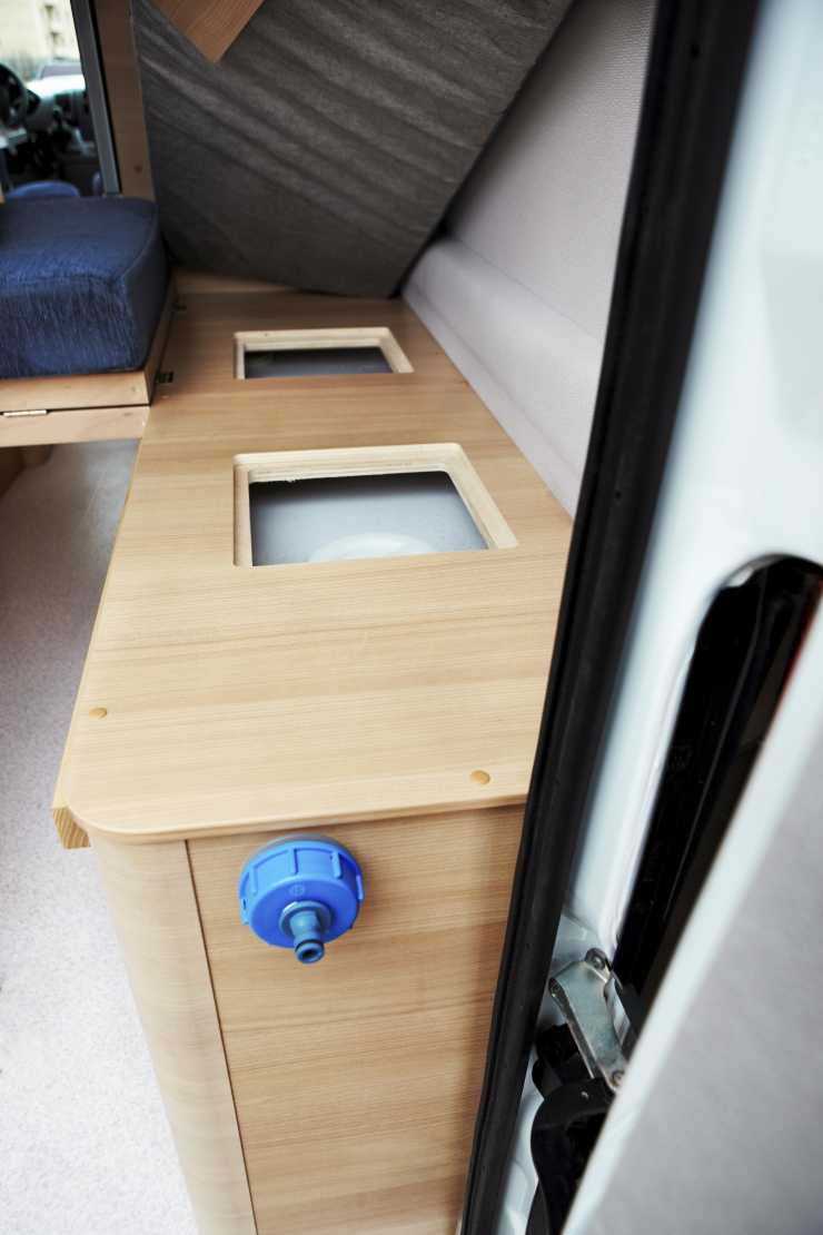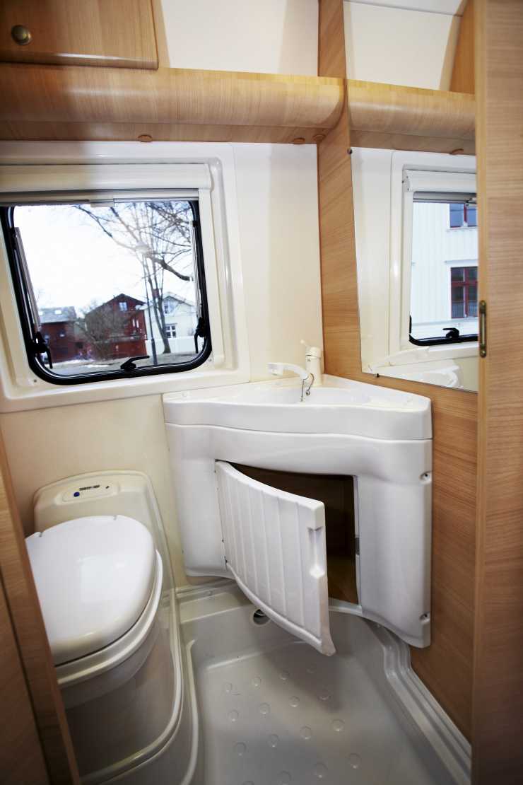 Fönster och spegel gör toalettutrymmet ljust. Ont om skåp, men annars är utrymmet bra för en så pass liten bil.