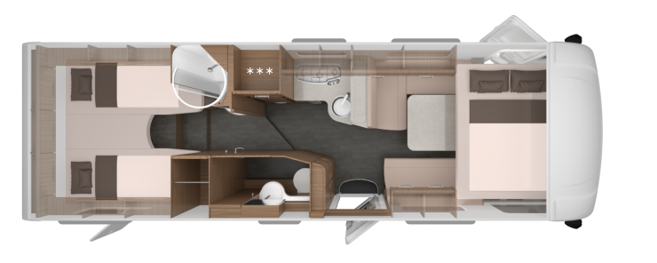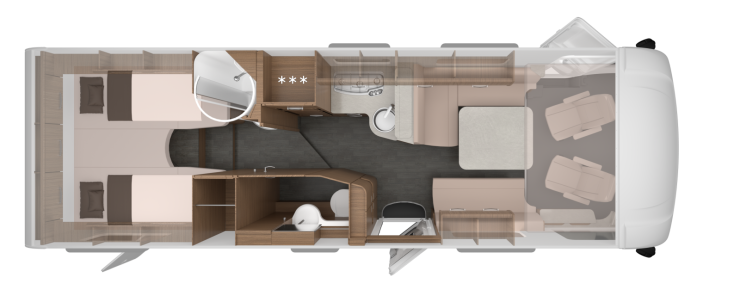 Dusch och toalett är separerade på respektive sida i bilen men inte mitt emot varandra och alldeles framför sängarna vilket är vanligt. Här är duschen placerad framför den vänstra sängen och mittemot finns en hemmastor garderob och efter det följer en väl tilltagen toalett. På motsatt sida av toaletten finns ett rymligt kylskåp på 177 liter samt köket där en trelågig rak spis finns samt straxt intill återfinns även en diskho, lite arbetsyta liksom förvaring i skåp och mjukstängande lådor.