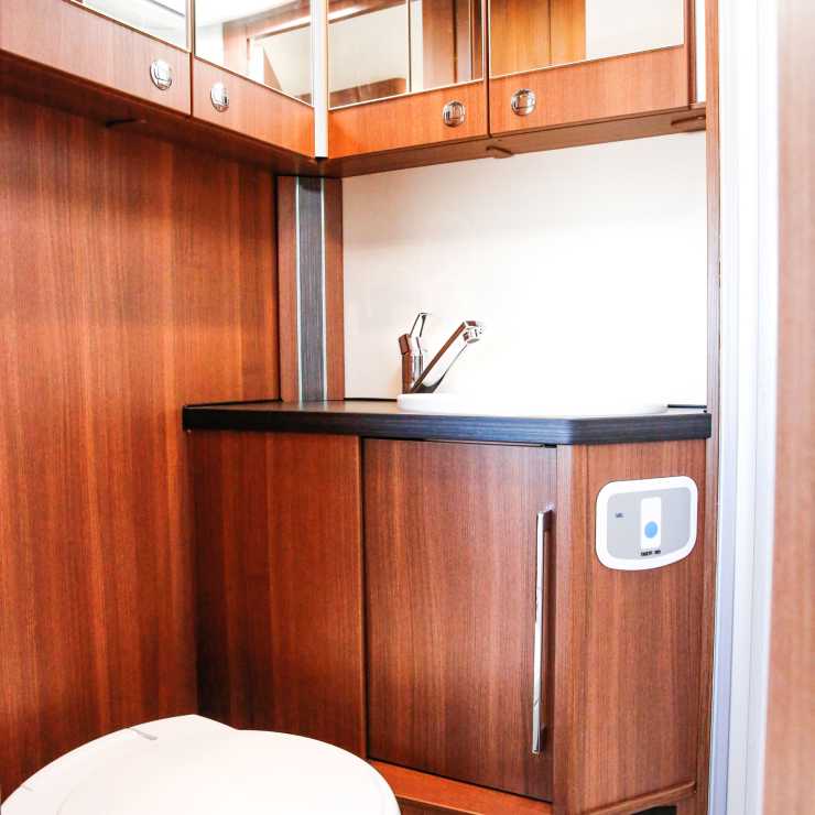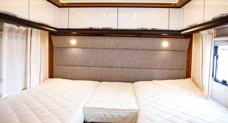 Längst bak är husbilen försedd med två långbäddar som enkelt kan bäddas ihop till en enda stor dubbelsäng genom att dra fram en iläggsskiva och lägga på extramadrasserna (två stycken) som passar mellan de båda långbäddarna. Utan extramadrasser fungerar träkonstruktionen utmärkt som nattduksbord. Jag gillar framförallt den ombonade känslan i sovdelen, den tygklädda sänggaveln som förstärker bostadskänslan.