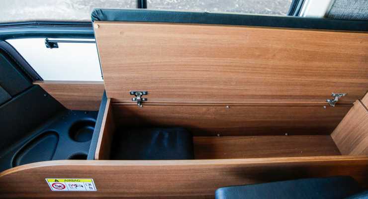 Generösa förvaringsutrymmen vid passagerarstolen.