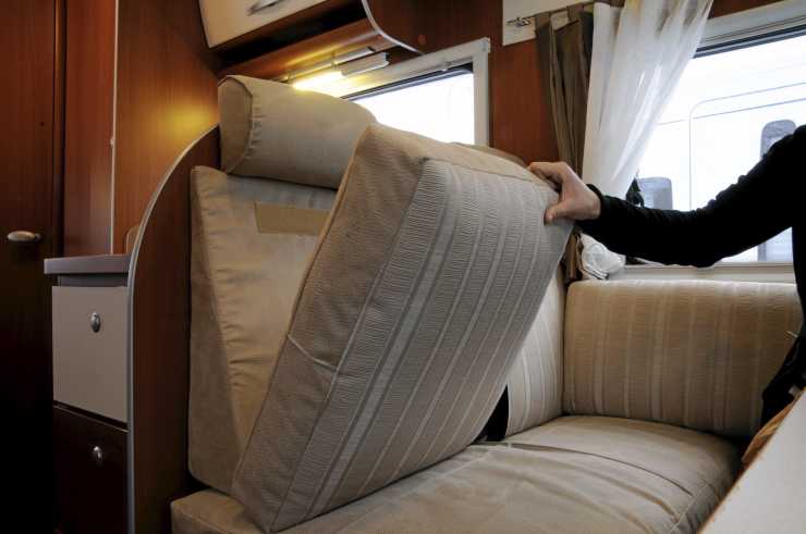 På motstående sida finns en liten men praktisk hörnsoffa med två bältade platser. Den lilla tvärdelen kan plockas bort under färd för att ge bättre fotutrymme för passagerare under färd.