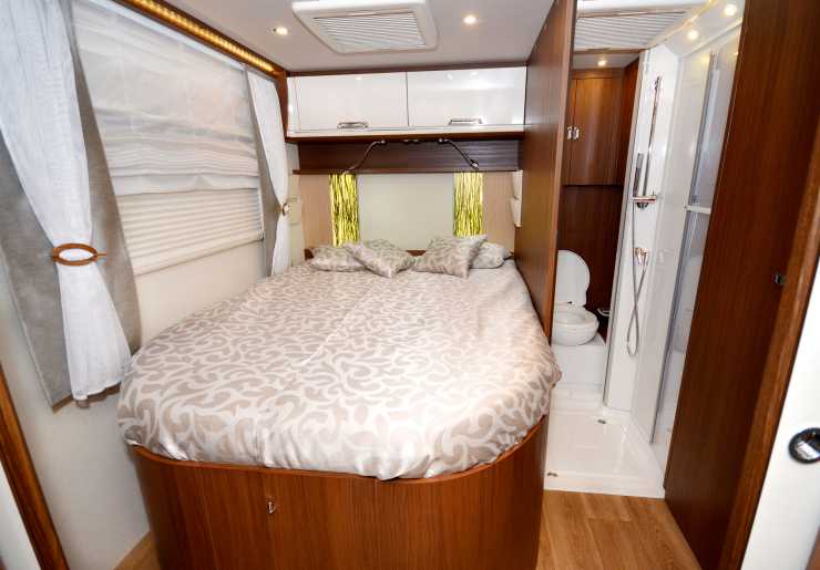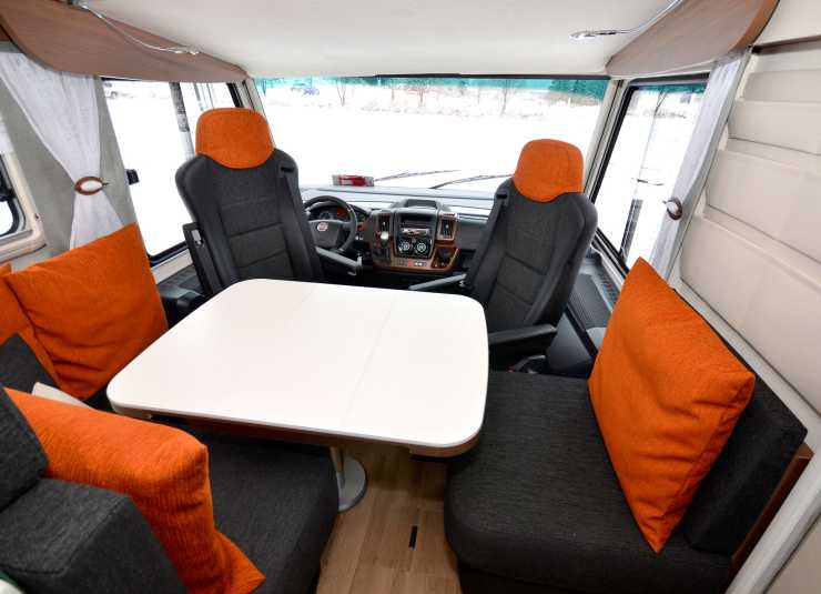 När man stiger in i Arto 66 F och slår på ljuset i huvudkontrollpanelen, känns inredningen tilltalande. Hela belysningen består av LED-teknik och utöver spotlamporna finns det gott om indirekt LED-belysning. En av dessa varnar snyggt för tröskeln mellan köket och sovavdelningen. Även Green Grass-panelerna som du bland annat kan se på väggen ovanför sängens huvuddel ger ett snyggare intryck. Inredningen känns högklassig med snygga träytor och högblanka vita överskåpsluckor. Det finns fyra bastextilier för sätena, ett mörkt och ett ljust tyg samt två skinnalternativ. Utöver det finns en omfattande inredningsvariation där textilierna kan bytas ut. Det finns massor av olika alternativ för att skapa en personlig inredningsdesign på tygerna.