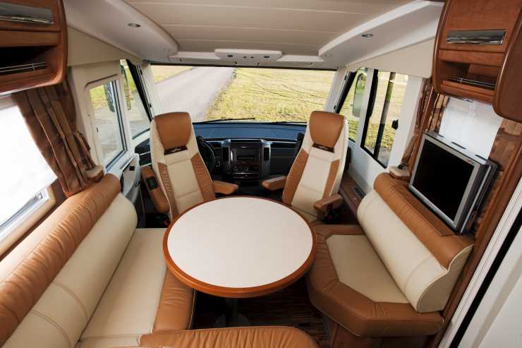 Samtliga stolar är klädda i snyggt skinn (tillval) med Carthagoemblem vid nacken och dubbla armstöd. Det enda negativa är att man sitter för lågt när stolarna vrids mot matbordet och dessutom skaver sitsarna mot varandra under själva vridmomentet. Det är alltså väldigt trångt mellan sittplatserna. I sittgruppen ryms annars cirka sex personer för en fika, men till middagsdukningen är fyra personer lämpligare. Bakom ryggstödet i sidosoffan, intill entrédörren, finns en tv som hissas upp med ett enkelt handgrepp. Sittgruppen kan inte bäddas men till gästerna finns i stället en bekväm dubbelsäng som kan sänkas ned från taket i förarhytten.Vid färd har de som åker i bakre sätet god sikt framåt och det finns fyra bältade platser i bilen.
