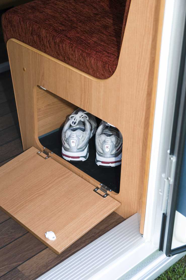 På insidan av ytterdörren sitter två krokar samt två praktiska förvaringsfack. Låset är aningen trögjobbat så det blir en del lirkande med nyckeln och onödigt dörrsmällande innan den går i lås. Till höger om dörren sitter tre klädkrokar och längst ned finns ett uppvärmt skofack med lucka. Den stora u-formade soffan ser inbjudande ut längst fram i vagnen. Soffan omges av tre stora fönster och belysningen runtom är bra; här finns två läslampor, tre spotlights i taklampan med dimmer samt åtta spotlights runt överskåpen.