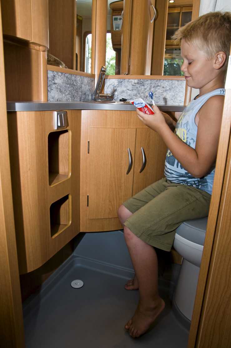 Toarummet är trevligt inrett med många förvaringsfack. Duscha får man göra i campingens servicehus.